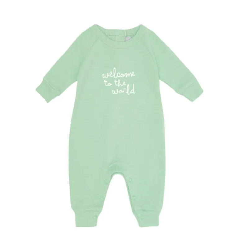 Bob & Blossom’s ‘Welcome to the World’ mint all-in-one are long sleeved with a popper fastening at the back of the neck and on the inside leg.