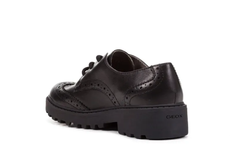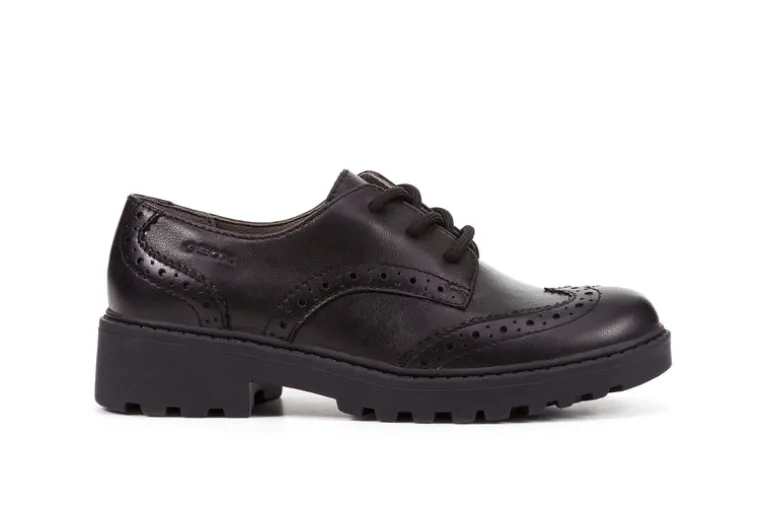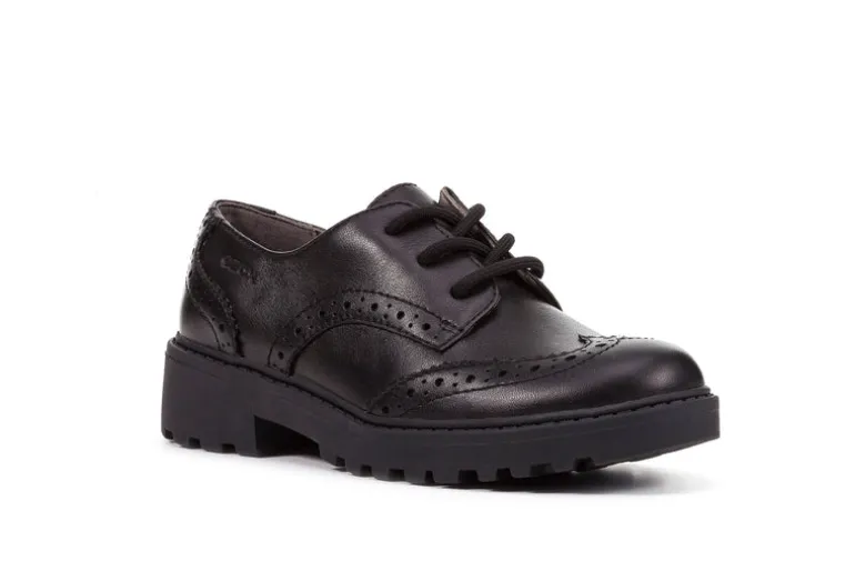 Casey is part of our extensive Geox school shoes range and makes an ideal lace-up for everyday wear. Made from black leather with a classic lace-up fastening. The outsole is flexible, lightweight and durable, and for hygiene and practicality, the leather lined foot bed is removable ensure feet feel dry all day long during wear.