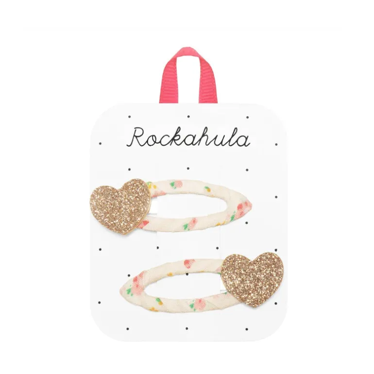 A pack of two gold glittery hearts, set upon pretty tiny blossom ribbon wrapped snap clips. These glittery heart shaped clips are loveable in every way!