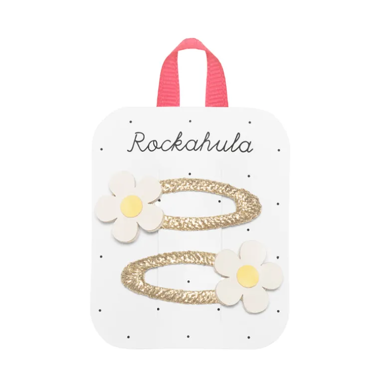 Smell the flowers this spring with our Daisy Daisy Clips. Two vibrant flowers adorn gold glitter ribbon wrapped snap clips.